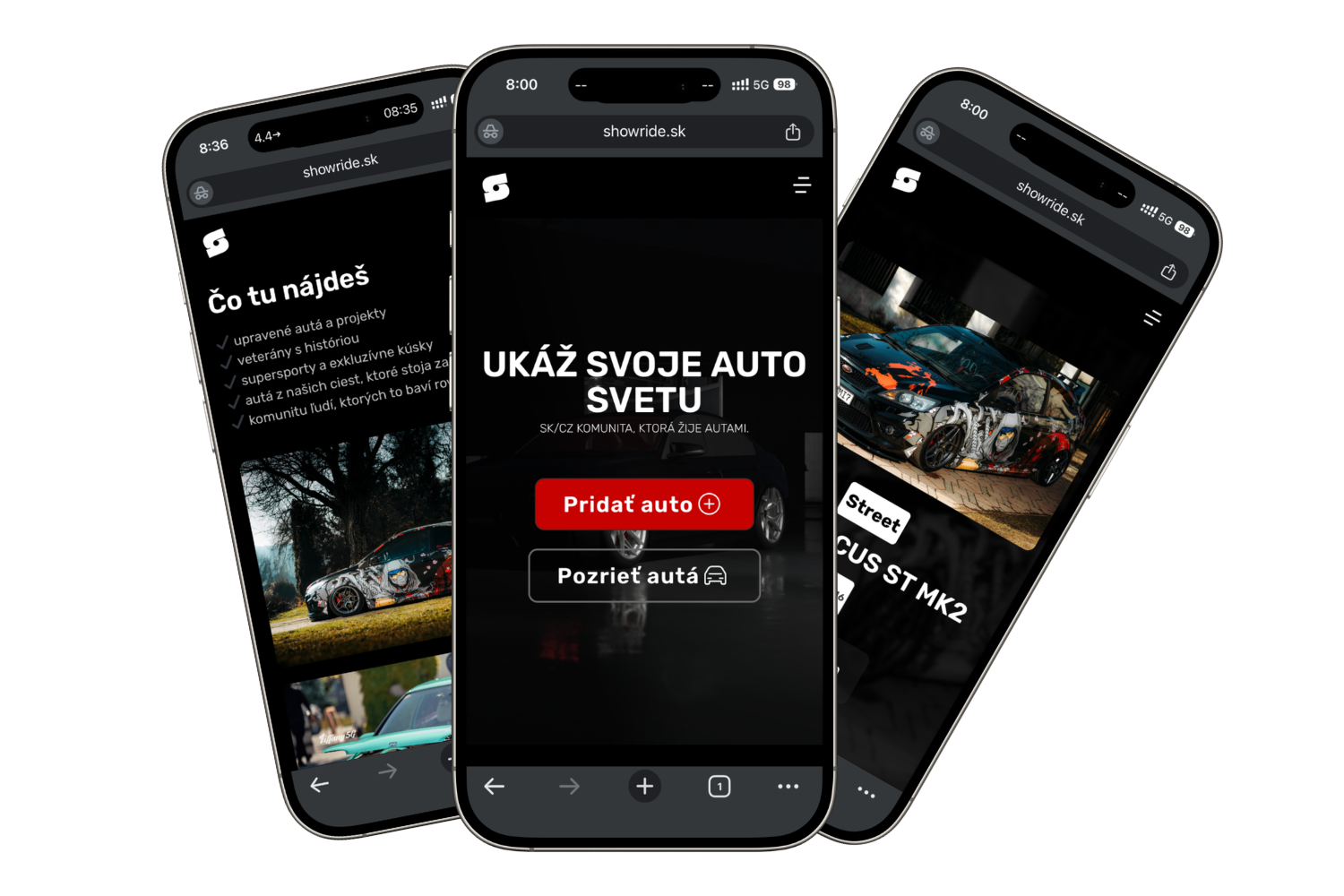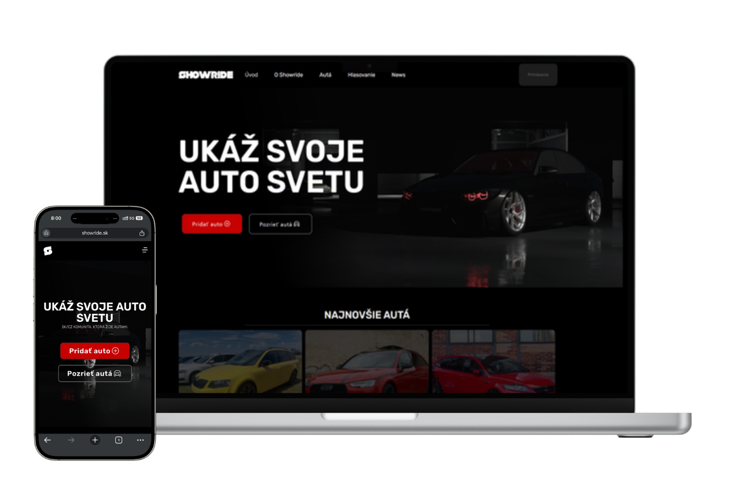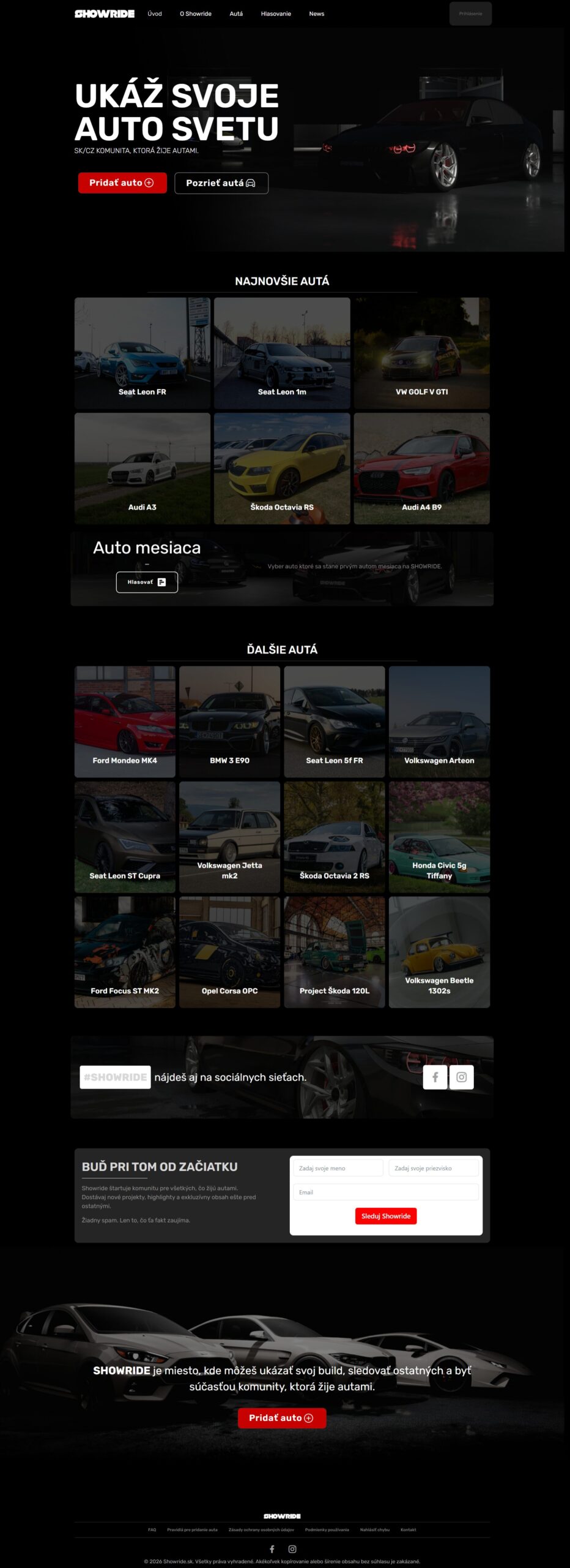 Showride, projekt zameraný na komunitu automobilových nadšencov a prezentáciu upravených áut, sme zastrešili aj z pohľadu návrhu a vývoja webovej stránky. Cieľom bolo vytvoriť modernú a prehľadnú platformu, ktorá umožní používateľom jednoducho prezentovať svoje vozidlá a zároveň objavovať projekty ostatných.
